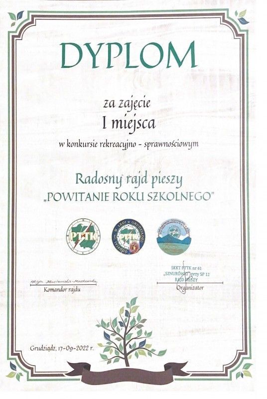 Dnia 17 września 2022 roku uczniowie naszej szkoły wzięli udział w Radosnym Rajdzie pieszym "Powitanie Roku Szkolnego" zorganizowanym przez SKKT PTTK nr 61 "Sznurówki" przy Szkole Podstawowej nr 12 w Grudziądzu.