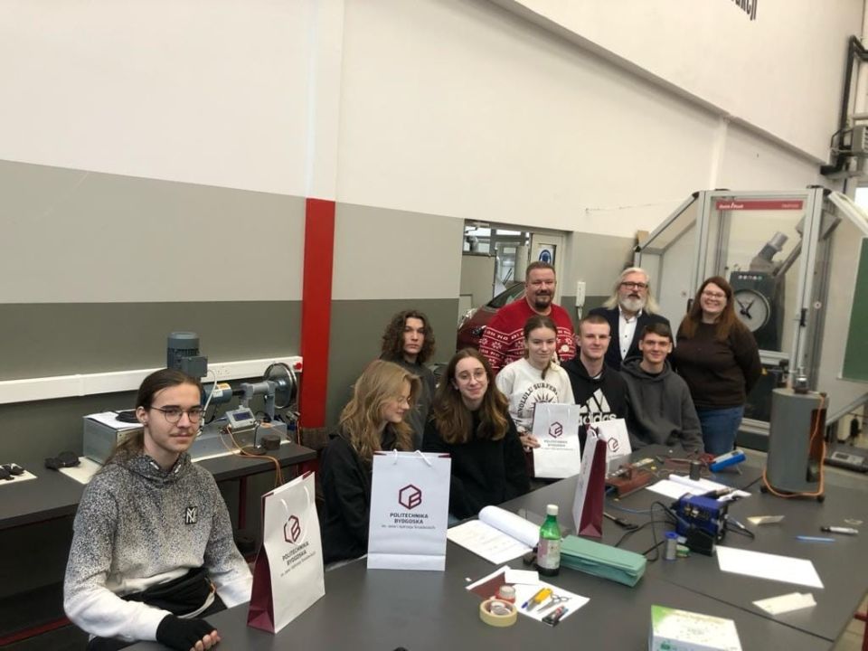 W dniu 15 grudnia ponownie gościliśmy w Bydgoszczy. Tematem zajęć na Wydziale Inżynierii Mechanicznej Politechniki Bydgoskiej była szeroko rozumiana wytrzymałość materiałów. W ramach projektu "Politechnika z Klasą" nasza Klasa Politechniczna, 2TRE, odbyła serie ćwiczeń laboratoryjnych na Politechnice Bydgoskiej. Zajęcia w Laboratorium Badań Materiałów i Konstrukcji przeprowadzili: prof. dr hab. inż. Stanisław Mroziński, dr inż. Michał Piotrowski i mgr inż. Piotr Swacha.
