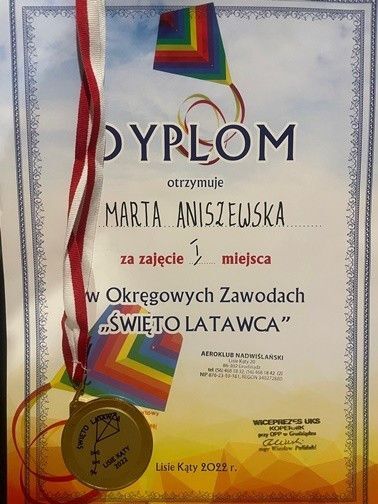 W dniu 22 października 2022 roku uczennica naszej szkoły Marta Aniszewska z klasy III TeO zajęła I miejsce w zawodach "święto Latawca", które odbyły się w Lisich Kątach.