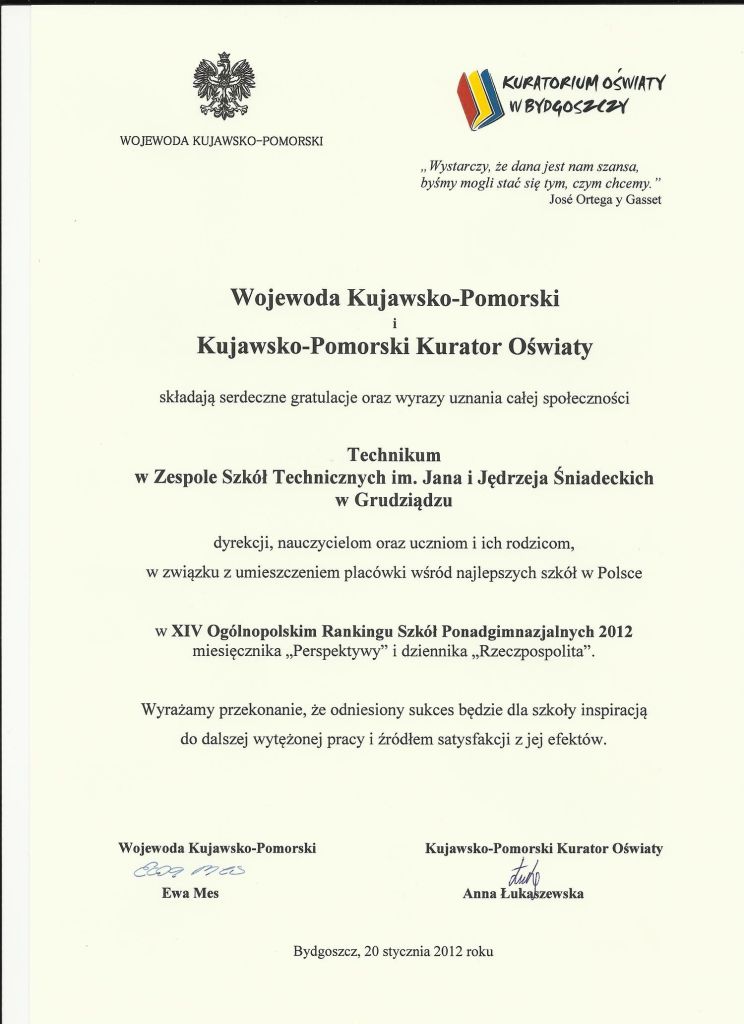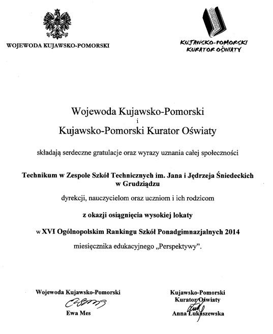 | Technikum w ZST im. J.J. śniadeckich w Grudziądzu po raz kolejny jest wśród 300 najlepszych techników w Polsce sklasyfikowanych w Rankingu Szkół Ponadgimnazjalnych PERSPEKTYWY 2020 i przysługuje mu tytuł „Srebrnej Szkoły 2020”. W najnowszym rankingu Perspektyw nasza szkoła zajęła 16. miejsce w województwie i 2. w Grudziądzu wśród techników. W rankingu ogólnopolskim zajęliśmy 238. miejsce i uzyskaliśmy tytuł "Srebrnej Szkoły". W Rankingu 2020 przeanalizowano wyniki 1728 techników. Decyzją Kapituły Rankingu ustalone zostały następujące kryteria i ich wagi: - sukcesy w olimpiadach 20% - matura – przedmioty obowiązkowe 20% - matura – przedmioty dodatkowe 30% - wyniki egzaminów zawodowych 30% W rankingu maturalnym uplasowaliśmy się na wysokim 67. miejscu w Polsce, najwyższym wśród grudziądzkich techników. Pliki do pobrania: - ranking techników 2020 - ranking egzaminów maturalnych 2020 Technikum w ZST im. J.J. śniadeckich w Grudziądzu jest wśród 200 najlepszych techników w Polsce sklasyfikowanych w Rankingu Szkół Ponadgimnazjalnych PERSPEKTYWY 2019 i przysługuje mu tytuł „Srebrnej Szkoły 2019”. W najnowszym rankingu Perspektyw nasza szkoła zajęła 7. miejsce w województwie i 1. w Grudziądzu wśród techników. W rankingu ogólnopolskim zajęliśmy 160. miejsce i uzyskaliśmy tytuł "Srebrnej Szkoły". W Rankingu 2020 przeanalizowano wyniki 1728 techników - tylko tych, Decyzją Kapituły Rankingu ustalone zostały następujące kryteria i ich wagi: - sukcesy w olimpiadach 20% - matura – przedmioty obowiązkowe 20% - matura – przedmioty dodatkowe 30% - wyniki egzaminów zawodowych 30% W rankingu maturalnym uplasowaliśmy się na 132. miejscu w Polsce. Pliki do pobrania: - ranking techników 2019 - ranking egzaminów maturalnych 2019 Technikum w ZST im. J.J. śniadeckich w Grudziądzu jest wśród 200 najlepszych techników w Polsce sklasyfikowanych w Rankingu Szkół Ponadgimnazjalnych PERSPEKTYWY 2017 i przysługuje mu tytuł „Srebrnej Szkoły 2017”. W najnowszym rankingu Perspektyw nasza szkoła zajęła 12. miejsce w województwie wśród techników. W rankingu ogólnopolskim zajęliśmy 138. miejsce spośród 1700 techników i uzyskaliśmy tytuł "Srebrnej Szkoły". W rankingu maturalnym uplasowaliśmy się na 149. miejscu w Polsce. W rankingu Perspektyw oprócz wyników z egzaminów zawodowych brane są pod uwagę wyniki z egzaminu maturalnego oraz olimpiad. Pliki do pobrania: - ranking techników 2017 - ranking egzaminów maturalnych 2017 Zespół Szkół Technicznych zajął 94. miejsce w Polsce w rankingu STEM Perspektywy 2016. Jako jedyne technikum w Grudziądzu znaleĽliśmy się w tym prestiżowym rankingu! Pełna tabela rankingu: [tabela] Perspektywy publikują co roku rankingi szkół ponadgimnazjalnych, szkół wyższych i kierunków studiów. Od czerwca 2015 magazyn publikuje również Ranking Liceów STEM, a od tego roku także Ranking Techników STEM. STEM – czyli Science, Technology, Engineering, Mathematics (nauka, technologia, inżynieria i matematyka) to te obszary kształcenia, przez które wiedzie najkrótsza droga do kariery w nauce i technice. Hasło STEM jest powszechnie znane w edukacji i gospodarce USA i innych krajów. Wiadomo tam, że bez dobrej edukacji w zakresie STEM nie ma innowacyjności, rozwoju i dobrobytu. Najwyższy już czas, żeby świadomość taka upowszechniła się również szeroko w Polsce. Ranking Techników STEM Perspektywy 2016 uwzględnia szkoły, w których maturę w maju 2015 r. zdawało minimum 12 maturzystów, a średnie wyniki szkoły z matematyki były nie mniejsze niż 0,75 średniej krajowej. Przyjęte kryteria Rankingu to: I. Wyniki matury na poziomie rozszerzonym z przedmiotów: matematyka, fizyka, chemia, biologia oraz informatyka (50%); II. Wyniki matury obowiązkowej z matematyki (35%); III. Sukcesy szkół w olimpiadach przedmiotowych, krajowych i międzynarodowych, odpowiadających swoim profilem zakresowi STEM (15%). Szczegółowo o rankingu: [ranking] Szczegóły metodologii: [metodologia] W corocznym rankingu Perspektyw zajęliśmy 142. miejsce w Rankingu Maturalnym Techników 2016: [pobierz] Technikum w ZST im. J.J. śniadeckich w Grudziądzu jest wśród 100 najlepszych techników w Polsce sklasyfikowanych w Rankingu Szkół Ponadgimnazjalnych PERSPEKTYWY 2015 i przysługuje mu tytuł „Złotej Szkoły 2015”. W najnowszym rankingu Perspektyw nasza szkoła zajęła 1. miejsce w Grudziądzu oraz 9. miejsce w województwie wśród techników! W rankingu ogólnopolskim zajęliśmy 95. miejsce i jako jedyna szkoła z Grudziądza (technika i licea) uzyskaliśmy tytuł "Złotej Szkoły". W rankingu egzaminów zawodowych uplasowaliśmy się na wysokim 63. miejscu w Polsce. W rankingu Perspektyw oprócz wyników z egzaminów zawodowych brane są pod uwagę wyniki z egzaminu maturalnego oraz olimpiad. Pliki do pobrania: - ranking techników 2015 - ranking egzaminów zawodowych 2015 Po raz szesnasty Perspektywy opublikowały Ranking Szkół Ponadgimnazjalnych. Nasza szkoła w Rankingu Techników 2014 zajęła 123. miejsce w Polsce i 11. miejsce w województwie kujawsko-pomorskim. W rankingu egzaminów zawodowych w zawodzie technik ochrony środowiska zajęliśmy 9. miejsce w Polsce. Dzięki tak wysokiej lokacie szkoła otrzymała tytuł „Srebrnej Szkoły 2014”. Decyzją Kapituły zostały ustalone następujące kryteria Rankingu Techników 2014: sukcesy w olimpiadach 20 % matura – przedmioty obowiązkowe 25 % matura – przedmioty dodatkowe 25 % wyniki egzaminów zawodowych 30 % Uroczyste podsumowanie Rankingu odbyło się w Urzędzie Wojewódzkim w Bydgoszczy. Na tę uroczystość zaproszono również naszą szkołę. W tej corocznej uroczystości uczestniczyliśmy po raz trzeci. Z okazji naszego sukcesu Wojewoda Kujawsko-Pomorski Ewa Mes oraz Kujawsko-Pomorski Kurator Oświaty Anna Łukaszewska złożyły na ręce dyrektora Adama Szewczuka gratula