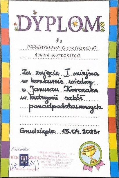 Przemysław Cieszyński i Adam Rutecki z klasy I TP zajęli I miejsce w konkursie wiedzy o Januszu Korczaku.